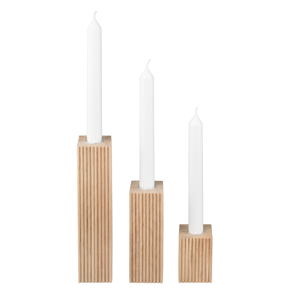 Add a touch of warmth and elegance to your home with the Dreva Oak Candle Holder Set from Blomus. A timeless design in oak with polished grooves and a stainless steel accent, these candle holders are in three heights, and can be grouped to make a stunning centrepiece on your table.