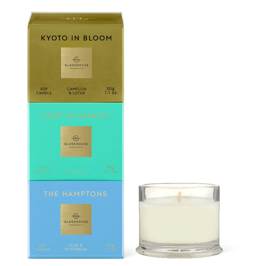 Glasshouse Fragrances's Candle Trio takes you around the world with their evocative fragrances. Experience the fruity and floral Forever Florence, the luscious, tropical A Tahaa Affair, and the sweet and ethereal Kyoto In Bloom. Made in Australia with natural lead-free cotton wicks and the highest quality non-toxic soy blend wax, Glasshouse Candles have a burn that is pure and intensely fragrant.