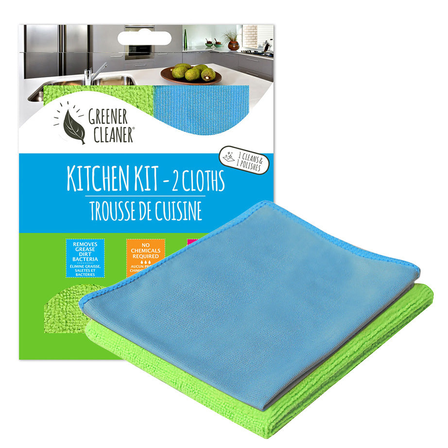 Green Cleaner's innovative clothes clean your home safely with no chemicals. Using only water to tackle tough messes, they are ideal for allergy and asthma sufferers. They remove dirt, grease, and bacteria on any surface. The Home Cleaning Kit comes with four clothes - an All-Purpose Cloth, a Window & Glass Cloth, a Stainless Steel Cloth, and a Shower & Bathroom Cloth. The Bathroom & Shower, Stainless Steel, Kitchen, and Window Kits come with two clothes, one for cleaning and one for polishing. All cloths are machine washable.