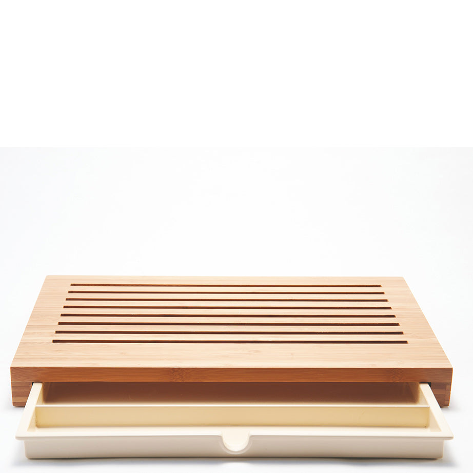 A beautiful, functional piece, Alessi's Sbriciola Bread Board, with its integrated crumb catcher, keeps your counters and table clean when in use. Designed by Anna and Gian Franco Gasparini, the cutting board is made from sustainable bamboo with a slide-out thermoplastic resin drawer divided to hold a bread knife and for catching crumbs as you slice.