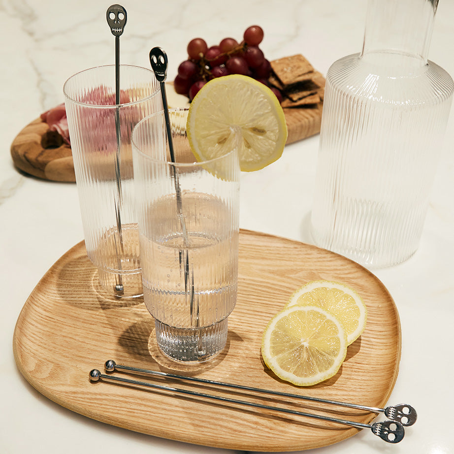 Raise your spirits with this set of Skull Cocktail Stirrers from Kikkerland. The stainless steel stirrers are topped with a spooky skull design.
