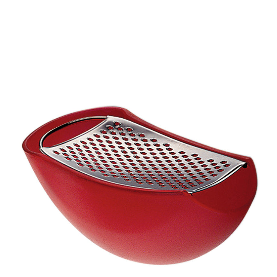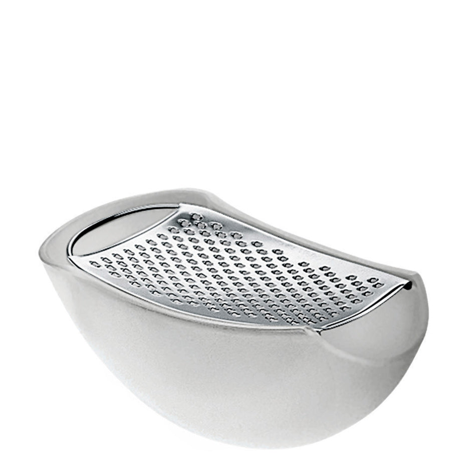 Designed by Alejandro Ruiz for Alessi, Parmenide grates, serves, and stores Parmesan and other hard cheeses. The stainless steel grater snaps on to the thermoplastic container which catches the cheese as it's grated, allowing you to sprinkle cheeses tableside. Part of the collection at the Museum of Modern Art in New York, this innovative and attractive piece is a must have for cheese lovers.