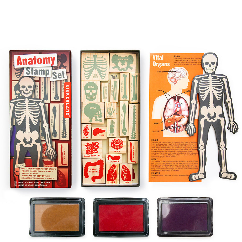 Budding doctors will love learning about anatomy and building the human body from the inside out with Kikkerland's Anatomy Stamp Set. The set comes with twenty rubber stamps, three stamp pads, a template for the body outline, and two illustrated anatomical guides.
