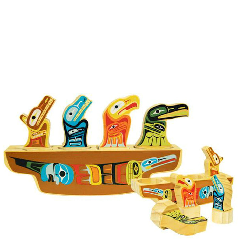 Young children can learn shapes with the sorting toy Animal Journey from Native Northwest. Authenticity of art and design is Native Northwest's mission to build a connection to Indigenous cultures. Designed by Heiltsuk artist Ben Houstie from Bella Bella, BC, whale, wolf, raven, and eagle have a spot in the canoe. With all four pieces in place, the toy doubles as a wood art piece.