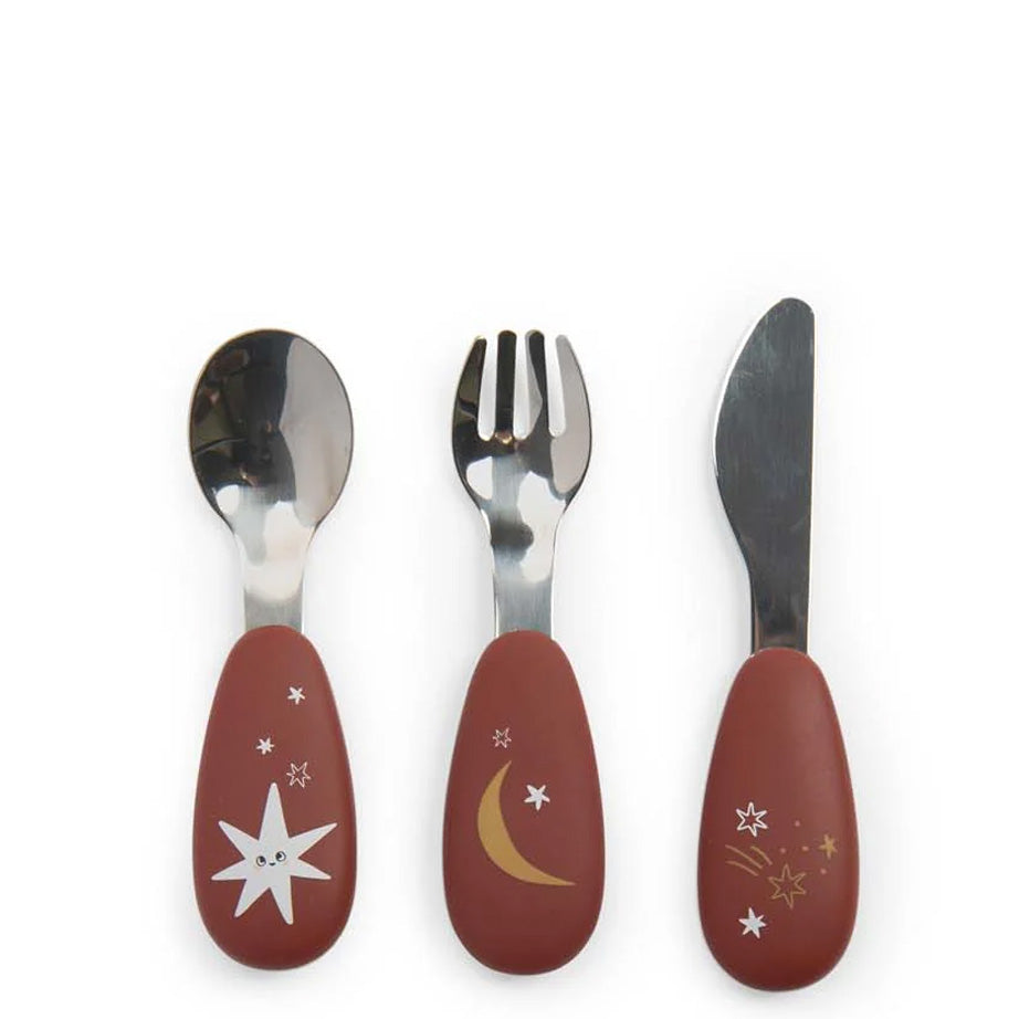 Featuring the sweet characters from Moulin Roty's Après la Pluie Collection, this three piece Baby Dish Set comes with a silicone plate, bowl, and sippy cup. Easy to hold cutlery is perfectly sized to help promote self feeding. Older children will love the stainless steel bottle with a leakproof cap, pop up straw, and cleaning brush for mom.