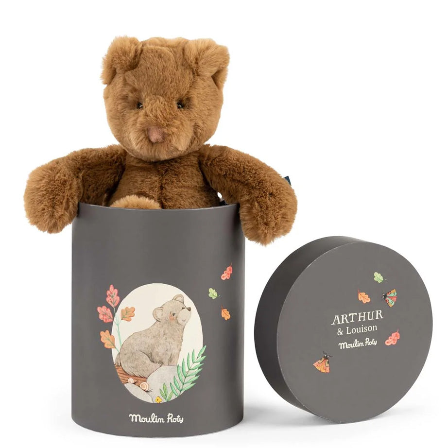Arthur is a small, sweet, and cuddly bear from Moulin Roty. He pops out from his decorative box, perfect for gifting.