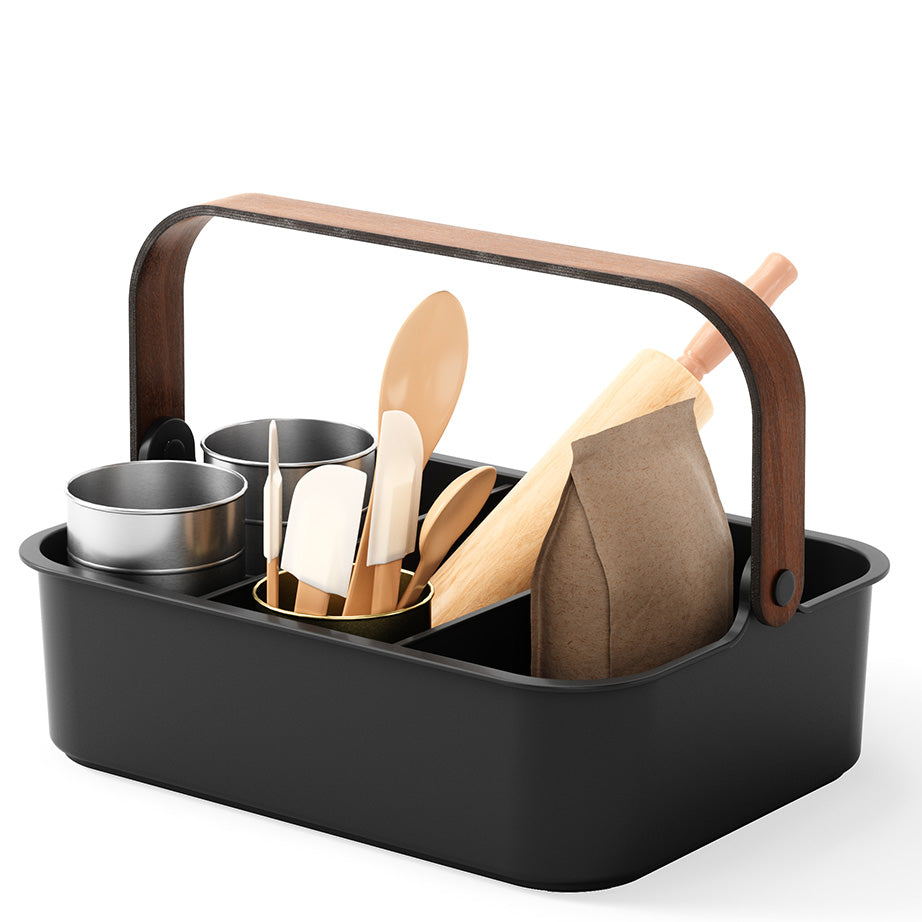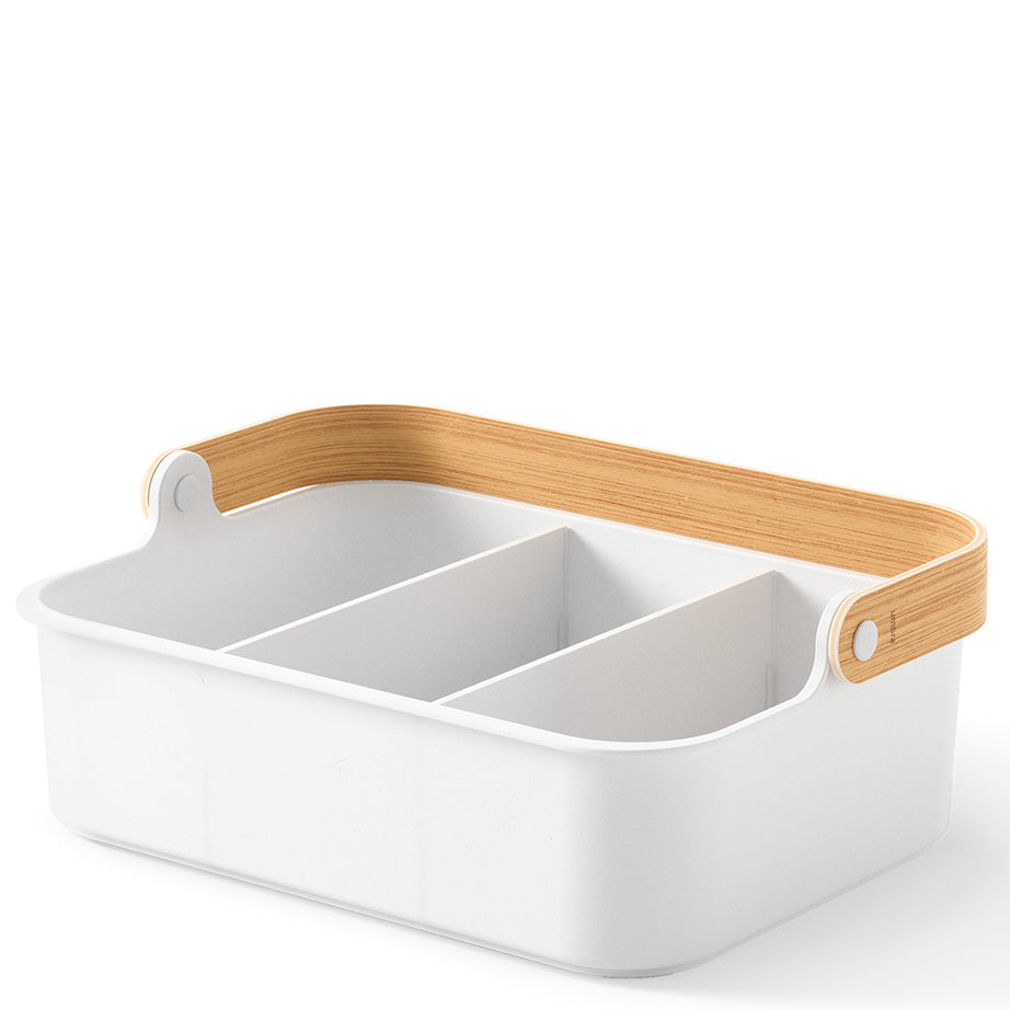 Umbra's Bellwood Stackable Bin is designed for versatile kitchen storage. Made with recycled plastic and renewable wood sources, it's is a practical, stylish, eco-friendly solution for organizing your pantry. Removable dividers make it versatile and the materials make it easy to clean. The generous wood handles allows you to move the caddy from pantry to the counter or flips down for stacking more than one.