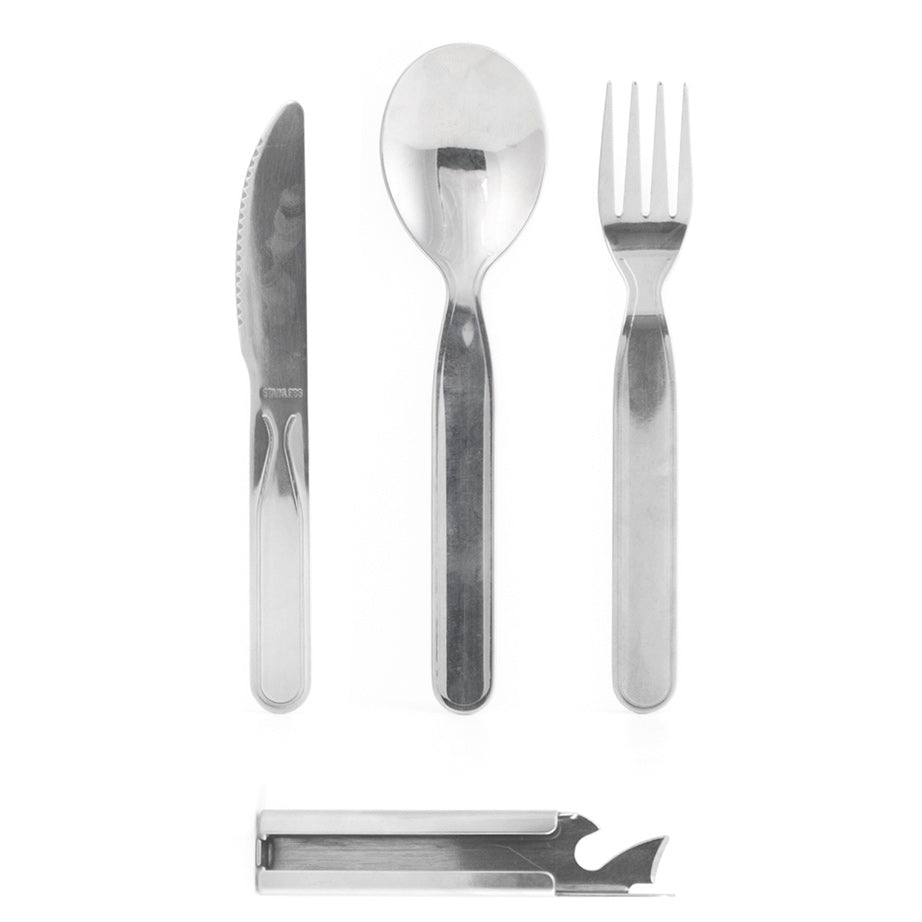 The Camping Utensils set from Kikkerland is essential for camping, travel, and any outdoor activities. Clever and compact, the sturdy stainless steel fork, knife, and spoon fit into the bottle opener, holding all of the utensils together. Toss it into your backpack, lunch bag, or keep in your glove compartment for use on-the-go.