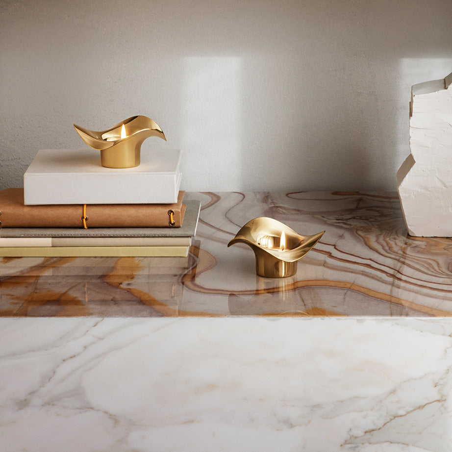 The Cobra Tealight Holders, designed by Constantin Wortmann for Georg Jensen, add warmth and elegance to your space. The soft curves, inspired by the snake it's named for, are rendered in mirror polished PVD gold plated stainless steel. These traditional but modern candleholders come in a set of two and will gracefully light your table.