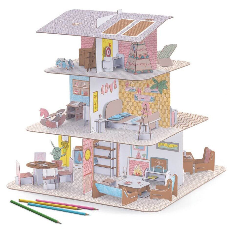 Color - Assemble - Play...with these kits from Djeco that's all you need to do for hours of entertainment. Construct a three-story doll's house or rocket with furniture and accessories made of sturdy cardboard and ready to be coloured in.
