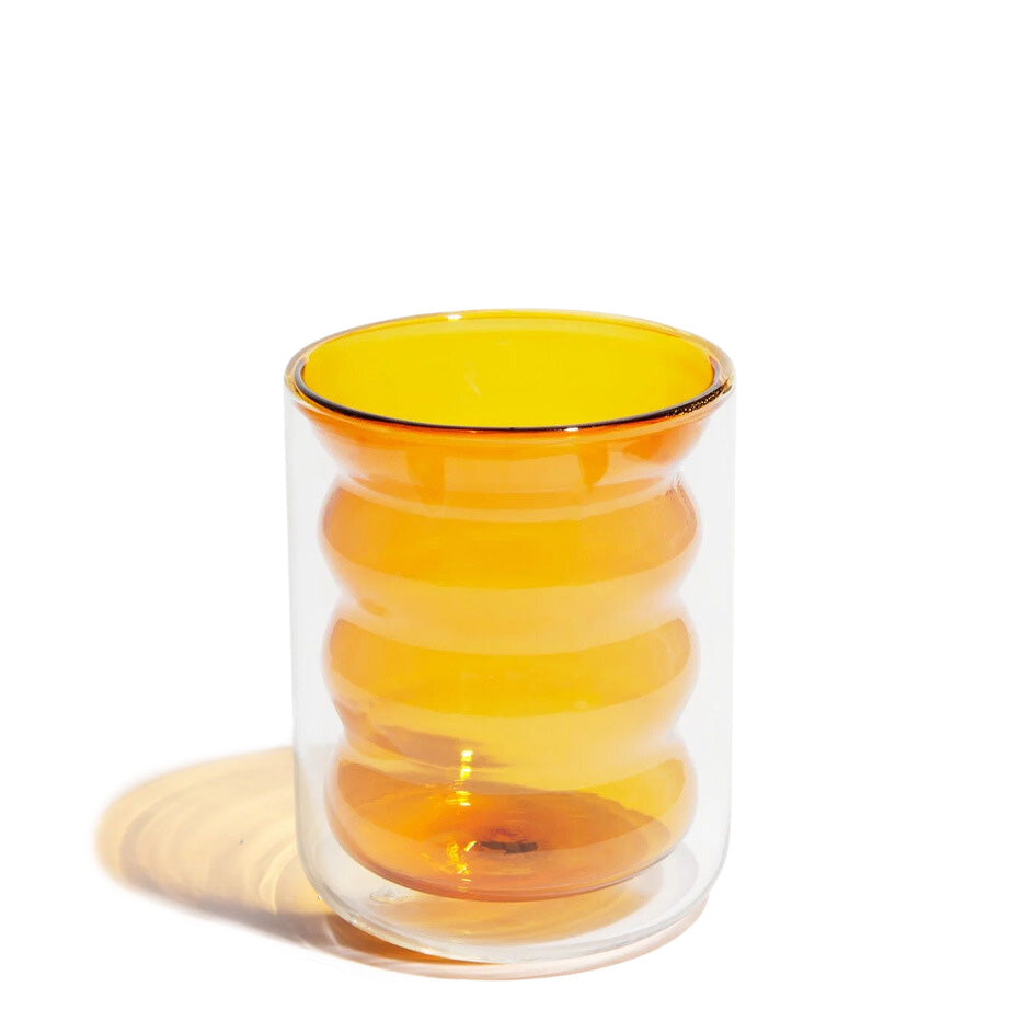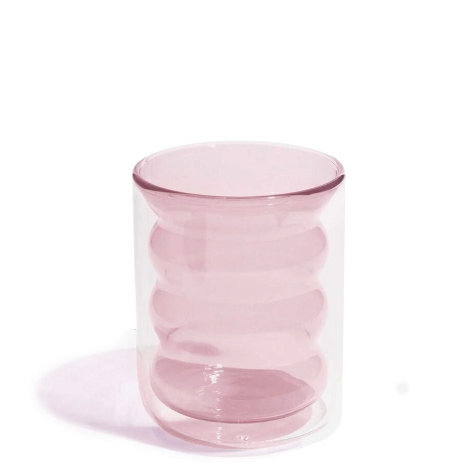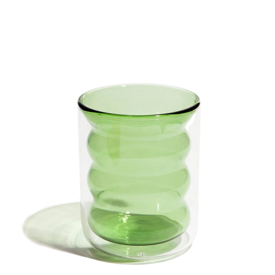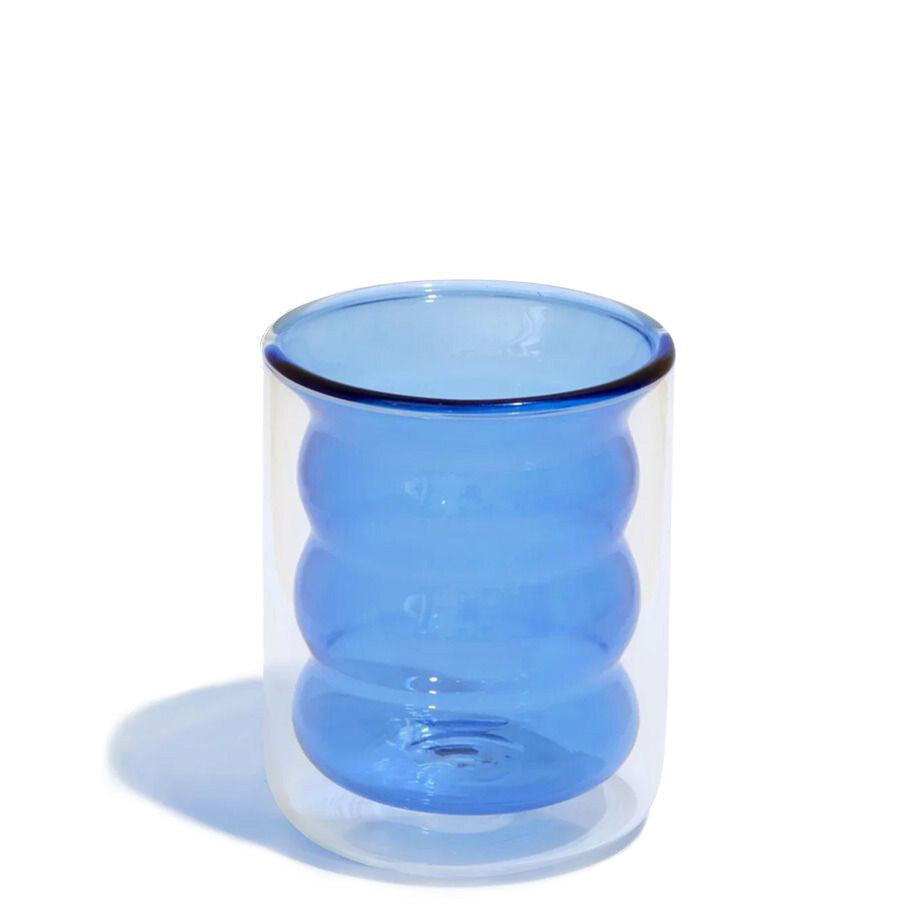 The hand-blown Double Wall Groovy Cup from Poketo adds a fun and stylish twist as you sip. It is crafted from borosilicate glass to form a double wall for insulation and temperature control. The exterior wall is clear which allows you to appreciate the unique inner pattern and colour.