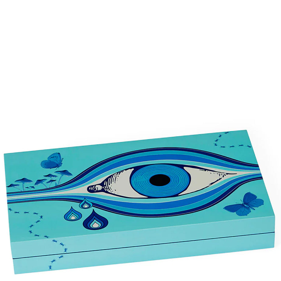 Delft blue hues and dreamy imagery decorate Jonathan Adler's Druggist Backgammon Set, making it a stylish statement open or closed. The high-gloss lacquer box has a bright and sophisticated interior and a colourful exterior. This luxe game set has a velvet lining, acrylic pieces, and magnetic closure.