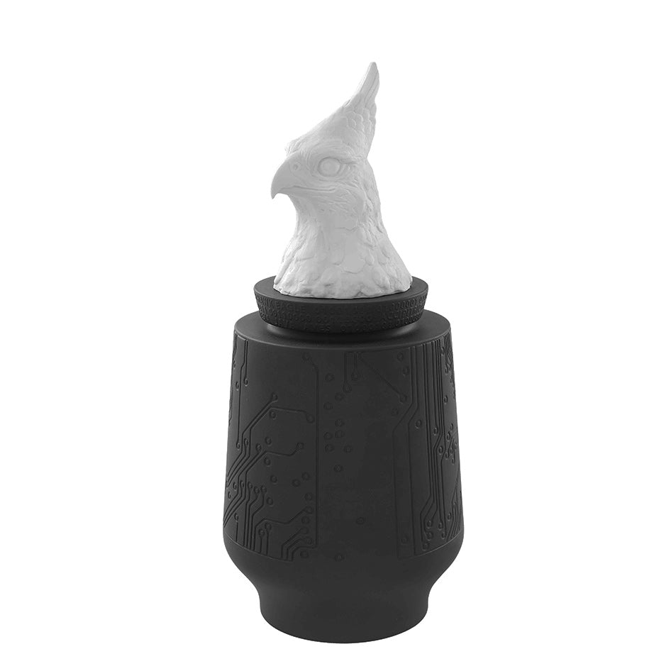Ancient Egyptian canopic jars were the inspiration for the Endangered Collection from Vista Alegre. Each canister features an endangered animal from the four major continents atop a jar decorated with reliefs of printed circuit boards. The head of a gazelle (Africa), wolf (America), lynx (Europe), and hawk (Asia) are made from white biscuit porcelain and they sit on top of a black biscuit porcelain jar. A portion of the proceeds from this award winning collection will fund initiatives to protect critically endangered species.