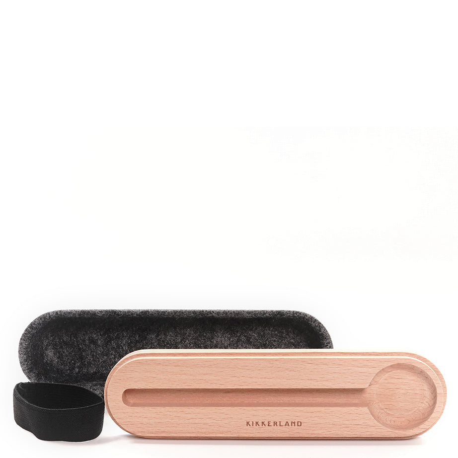 Kikkerland's Felt Pencil Case & Phone Stand is a multi-purpose must-have for your desktop. Keep pens, pencils, cables, and clips in the firm felt case. The wood top can be used as a ruler on one side and a phone stand on the other. Keep it closed with the elastic strap so you can take it with you wherever you go.