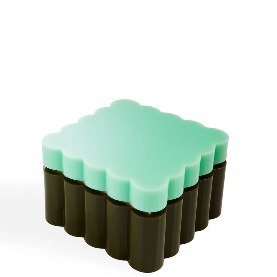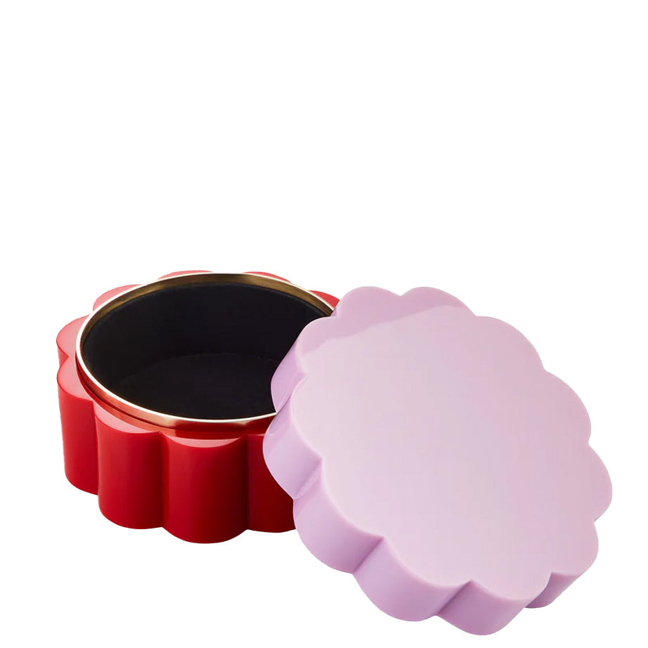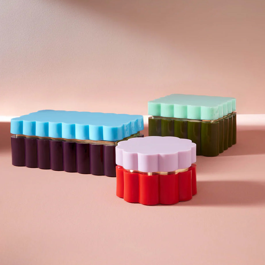 Fleur Boxes from Jonathan Adler are chic two-toned acrylic containers with scalloped edges for instant style. Each box is hand-polished to a glossy finish, with a recessed brass reveal for gem-like glamour. Use them singly or together for a colourful display.