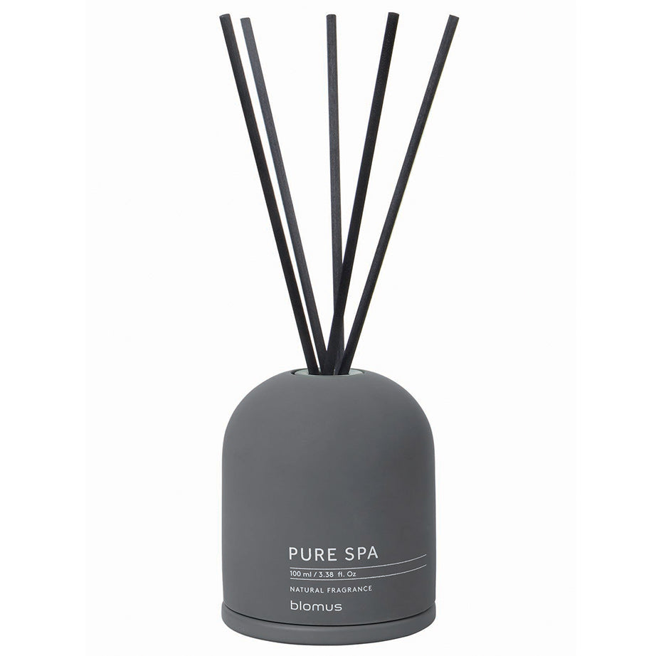 Enjoy the subtle scents of Fraga Room Fragrance Sets from Blomus's Pure Spa Collection. Each set comes with a coloured glass container in soothing colours with a concrete lid, five reed sticks, and fragrance.