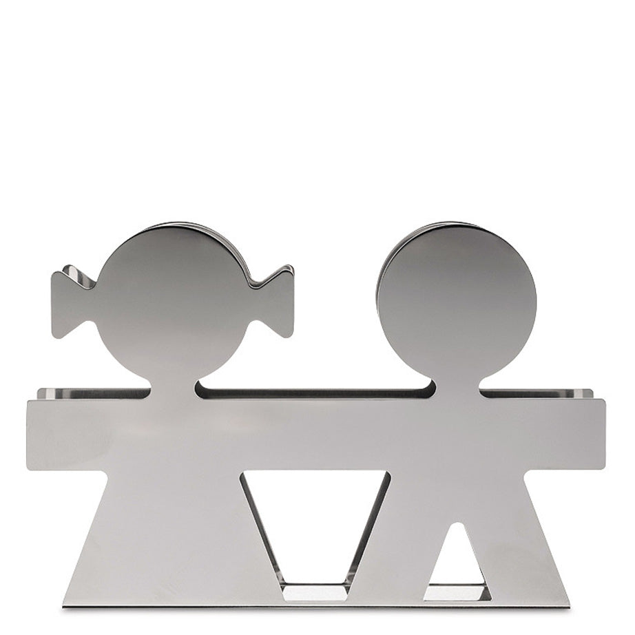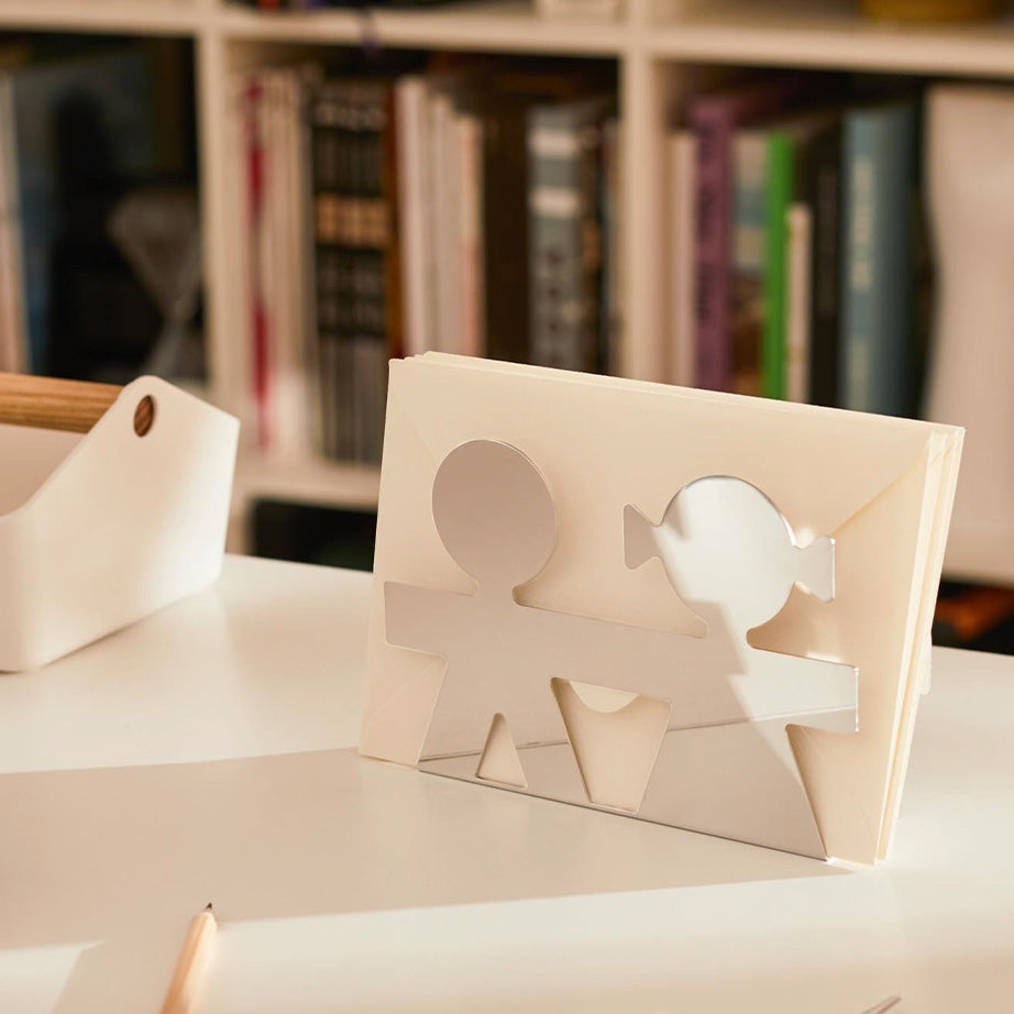 Stefano Giovannoni and Guido Venturini, then working together as King-Kong, designed the Girotondo Collection for Alessi in 1989. More than thirty years later, the collection, still popular, continues to delight. With its cut-out motif resembling little paper dolls, the playful design is featured on this envelope holder for your desk.