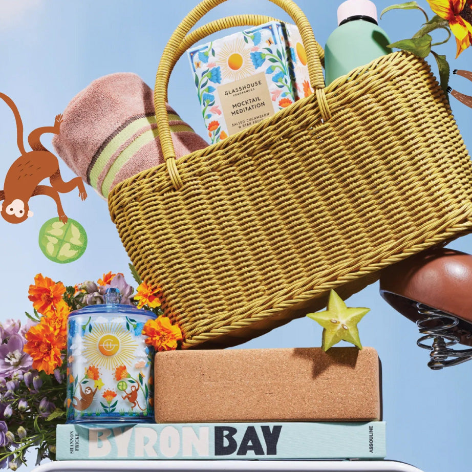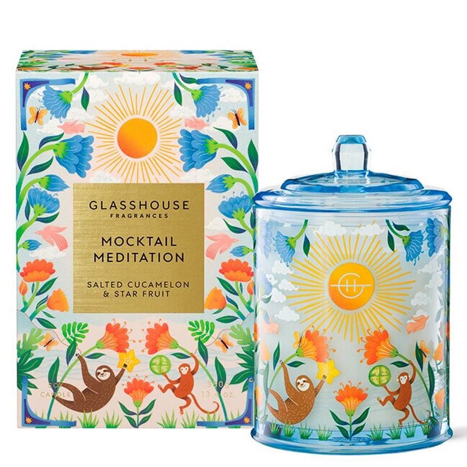 Like a perfect mocktail, the Mocktail Meditation Candle from Glasshouse Fragrances's Summer Refresh Collection is fresh and fruity, without being too sweet. With notes of salted cucamelon and star fruit, with a base of amber, musk, and cedar, it evokes sitting and sipping at a seaside café. This double-wick triple-scented candle is made from the highest quality soy blend wax and lead-free cotton wicks for a pure and intensely fragrant burn. Beautifully packaged for gifting, this limited edition candle comes in decorated glass vessel.