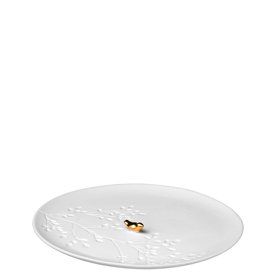 A Golden Bird glimmers on the matte white porcelain in this collection from Räder. The small lidded box and plate are perfect for holding jewellery, candies, or just to be appreciated for their delicate design.