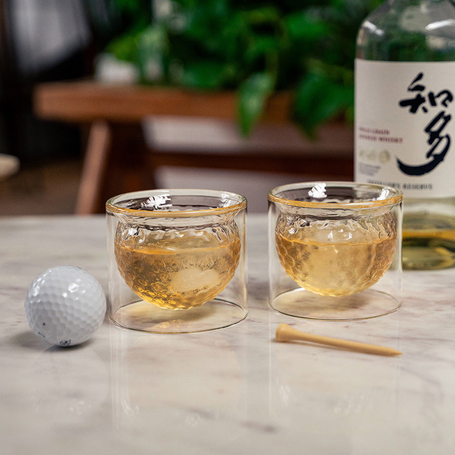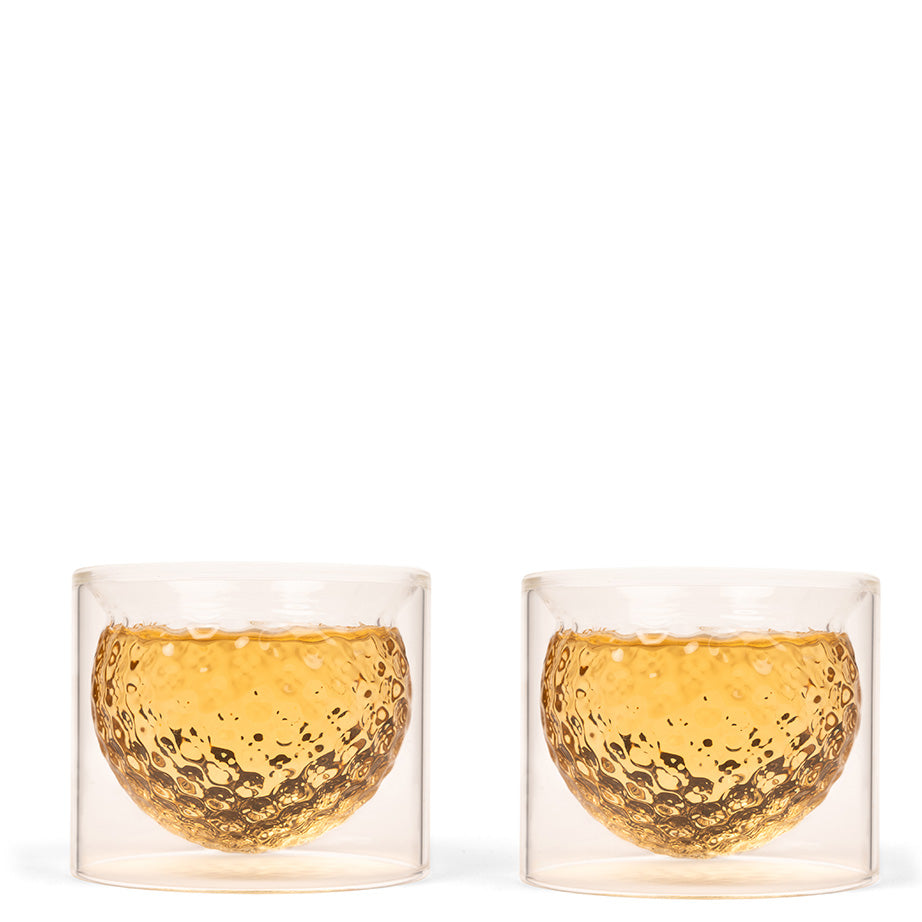Kikkerland's Golf Ball Glasses are just the thing for the golfaholic. These six-ounce glasses are made with durable, double-walled glass to regulate temperature and a curved lip for a smooth sip.