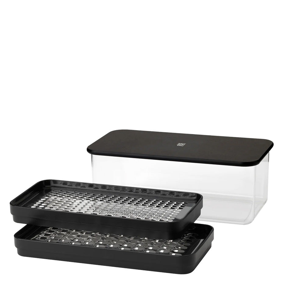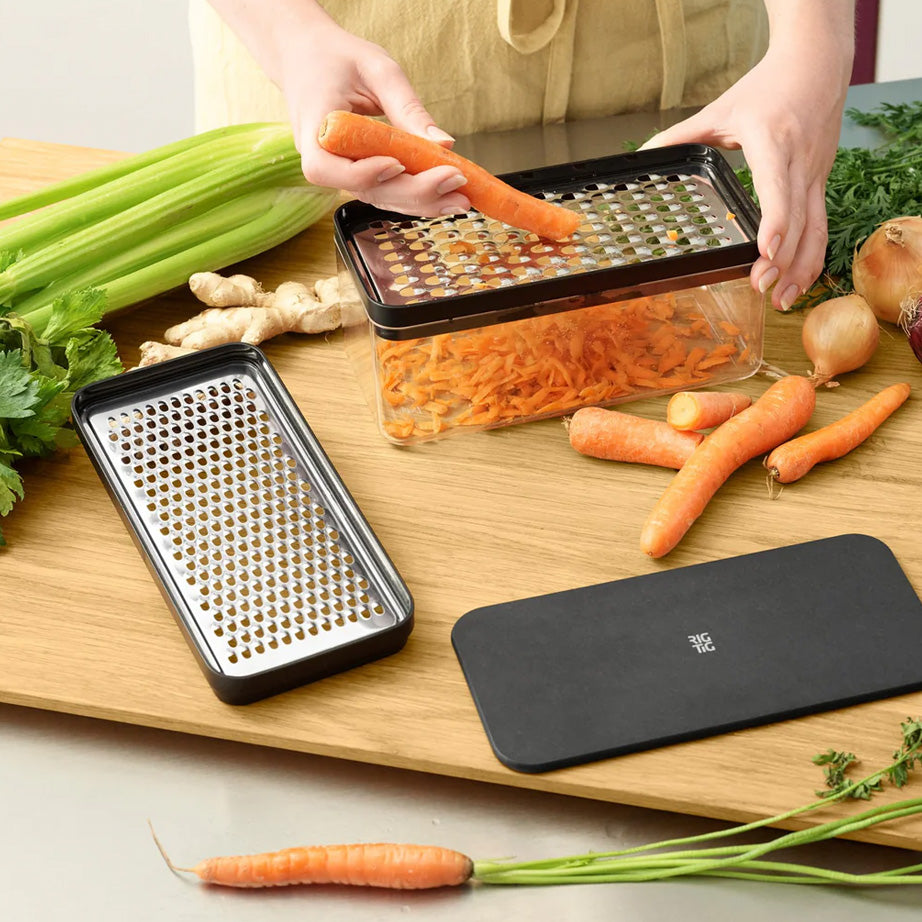 Making easy work of shredding vegetables, apples, and cheese, RIG-TIG's GRATE-IT has two graters which fits over a container. A simple but practical design, the grated food collects neatly in the container and the lid allows you to store any excess.