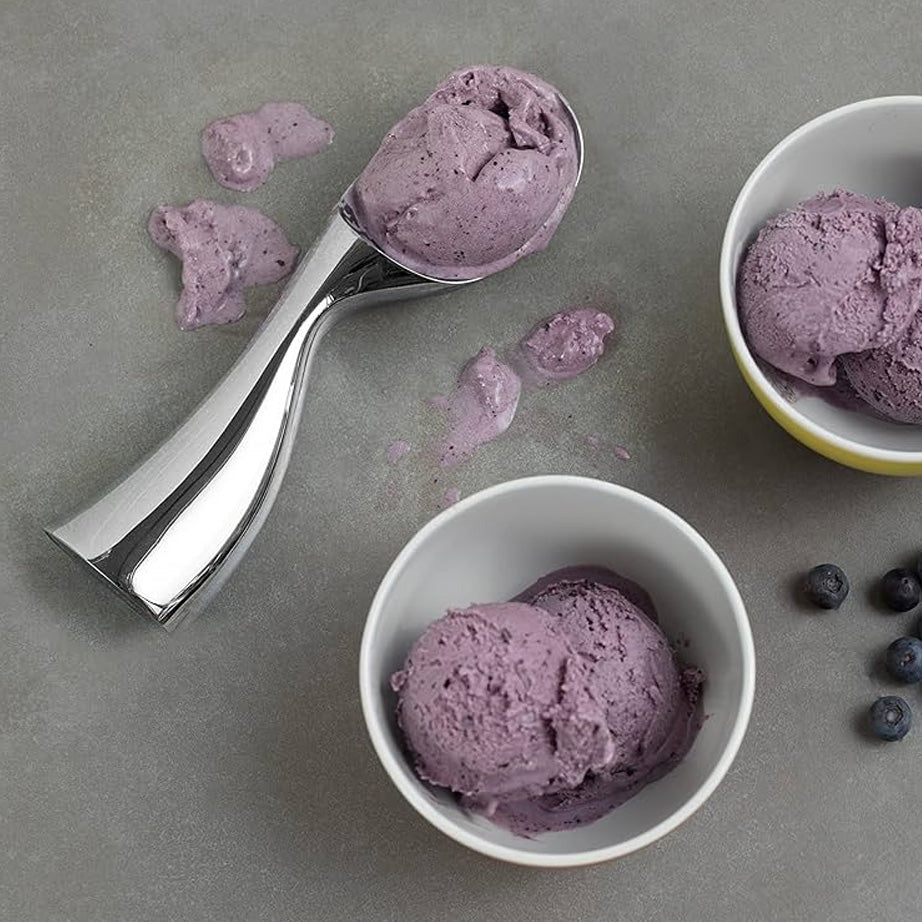 A sculptural, sinuous ice cream scoop designed by Karim Rashid for Nambé, Skoop makes serving frozen treats a pleasure. The sleek, curved handle has a wide, flat bottom, allowing it to stand upright. Skoop fits nicely in the hand, providing great leverage for "skooping" frozen ice cream. Made from stainless steel and zinc alloy, it's dishwasher safe.
