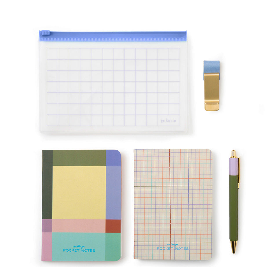 - On the Go Stationery Set: Black ballpoint pen, 2 notebooks, pen clip, storage pouch