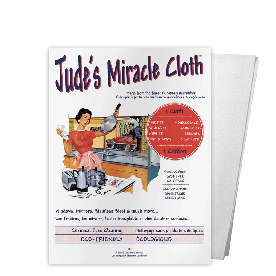 We think that you will love cleaning with Jude's Miracle Cloth. No more sprays and chemicals – just wet it with water, wring it out, and use it to wipe any surface clean. The secret to this eco-friendly cleaning cloth is in the patented microfibre weave, built for lifting dirt and oil and also trapping bacteria without chemicals. Jude's Miracle Cloth works beautifully on windows, mirrors, stainless steel, countertops, computer screens, and eyeglasses. Reduce paper towel waste and chemical pollutants by switching to this reusable and toxin-free cloth. Family run since 2009, Jude's Miracle Clothes is a proud Canadian company.
