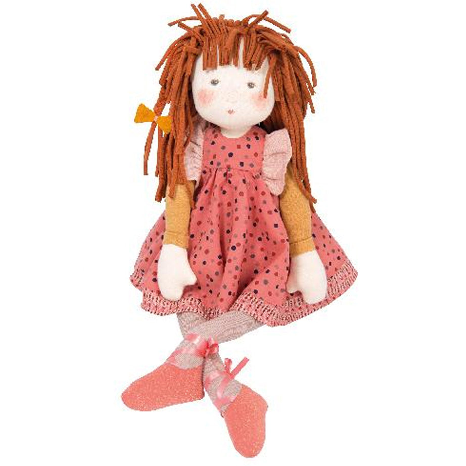 Long limbs, expressive faces, and pretty pinafores make Moulin Roty's Les Rosalies Rag Dolls sweet companions. From illustrations by Cecile Blindermann, these red-haired rag dolls have removable clothes and delicate ballet slippers.