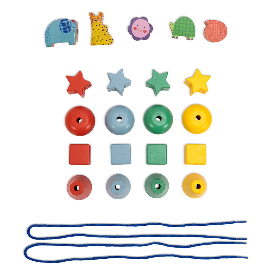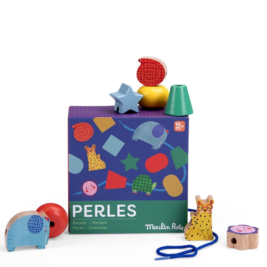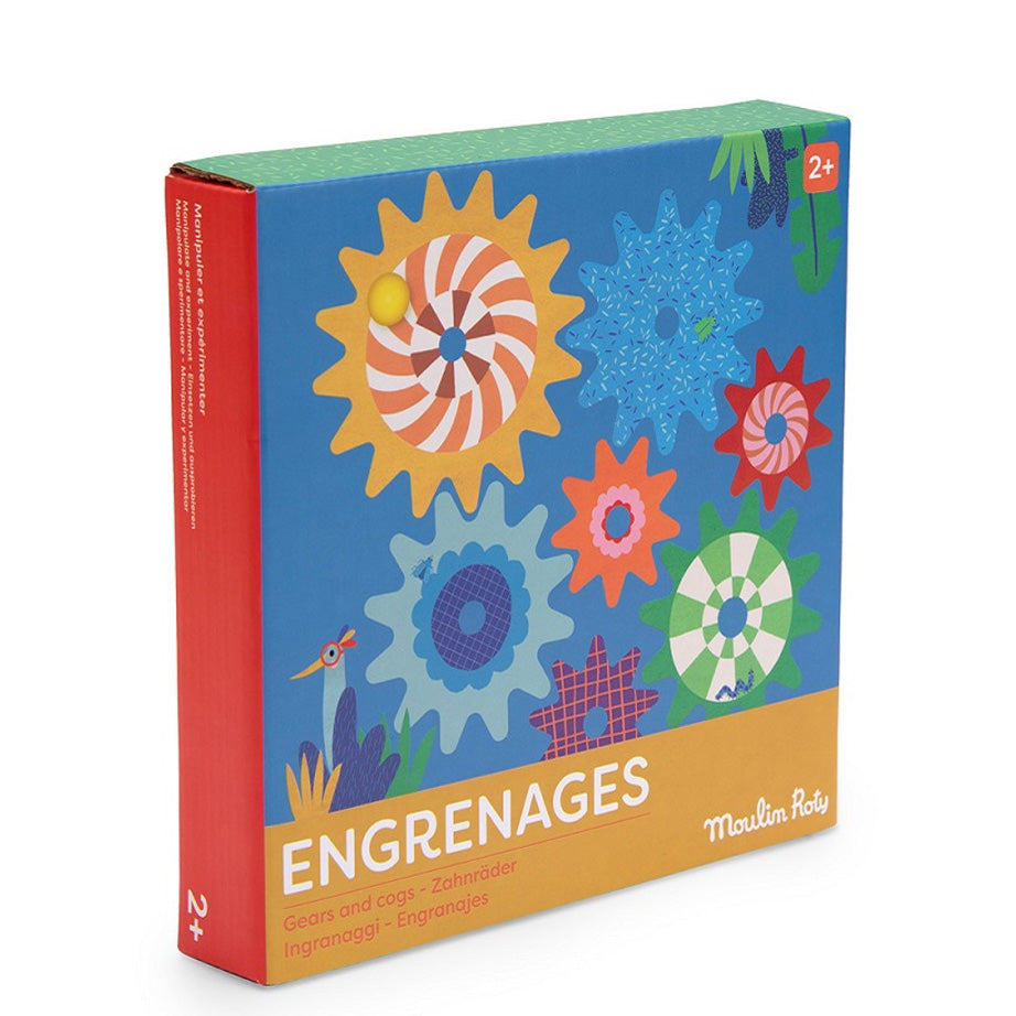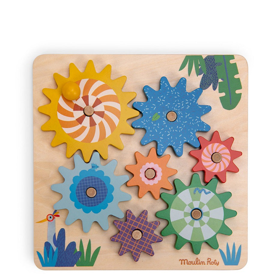 The charming graphics and vivid colours of Moulin Roty's Les Toupitis Collection take centre stage in activities perfect for early learning. Young children can work on coordination and observation threading animals on the laces or learn how gears work by positioning the seven multi-coloured toothed wheels on the wooden board and giving the yellow wheel a turn.