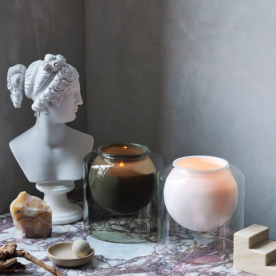 Light a Luna Candle from Skeem Design and add seductive scents to your room. Poured into a handblown glass vessel, the sphere seems to flow and glow when lit. Enjoy the warmth of the woodsy Sweet Balsam scent in the smokey glass vessel or the heady floral jasmine with sandalwood and amber notes of the Waxing Moon candle in the white glass vessel.