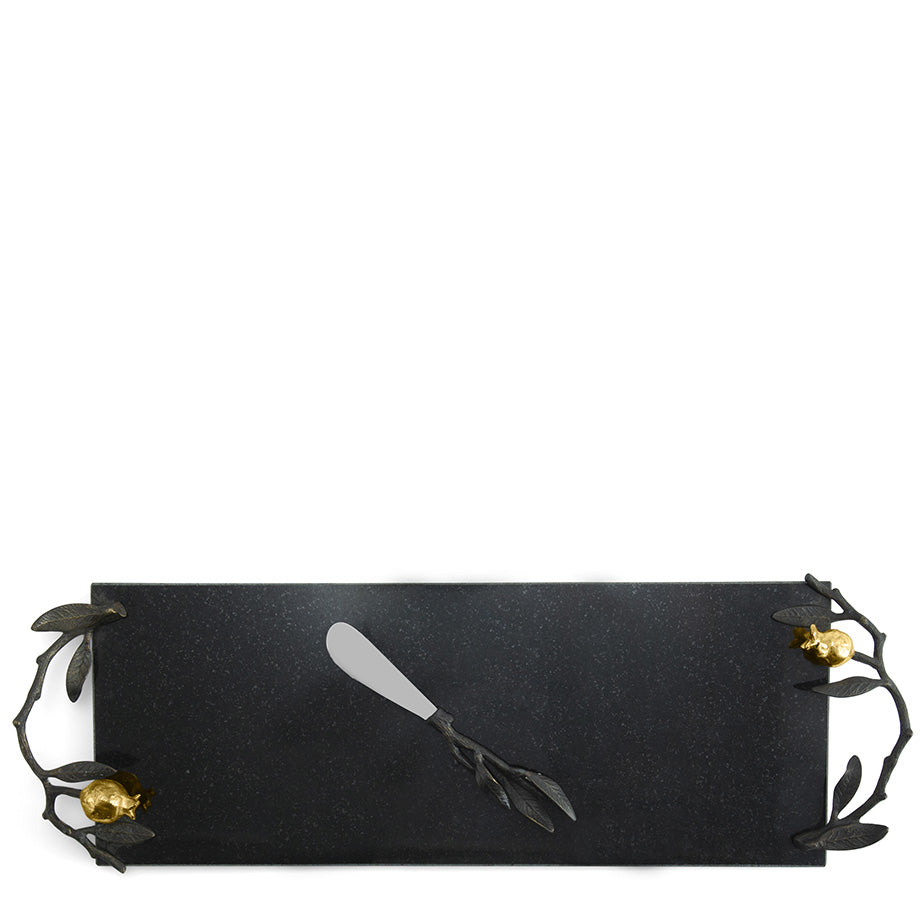- Cheese Board with Spreader: Granite with oxidized brass and 24K gold plate / 17.25" L x 5.75" W