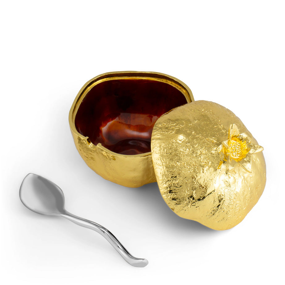 - Mini Pot with Spoon: Gold tone with enamel interior and nickelplated spoon / 3.25 W" x 3" H.