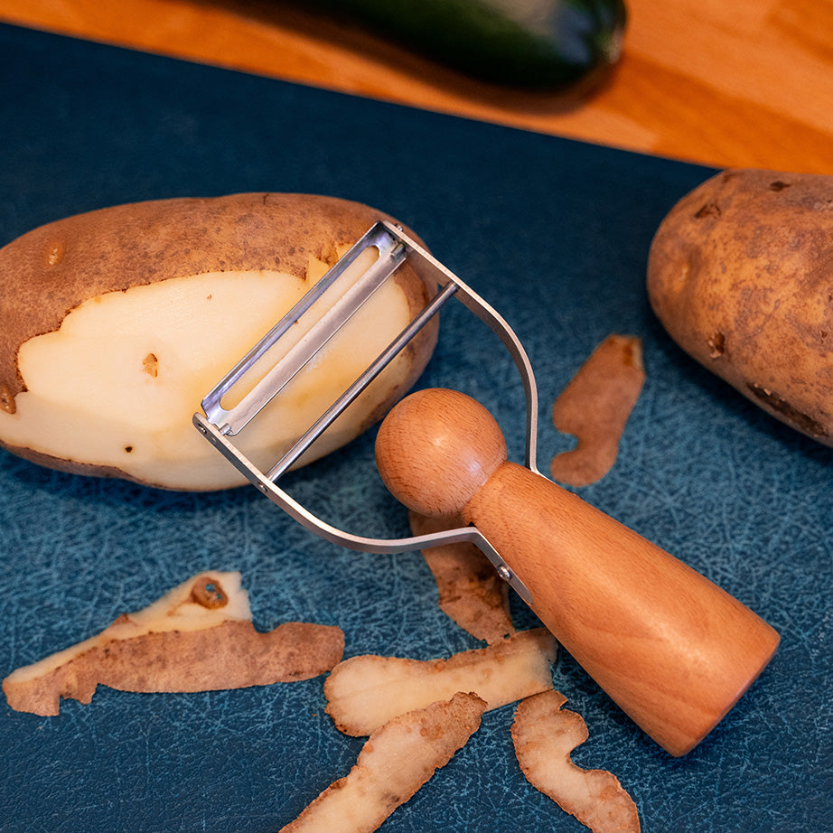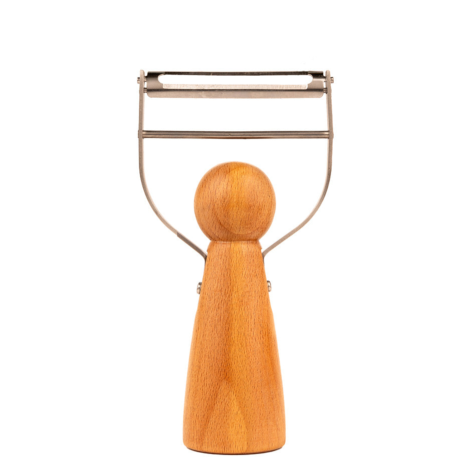 Effortlessly peel fruits and vegetables with Mr. Peel, your new essential kitchen pal from Kikkerland. The self-standing beechwood handle has a comfortable grip and keeps the stainless steel blades off the countertop, making sure that everything stays nice and clean.
