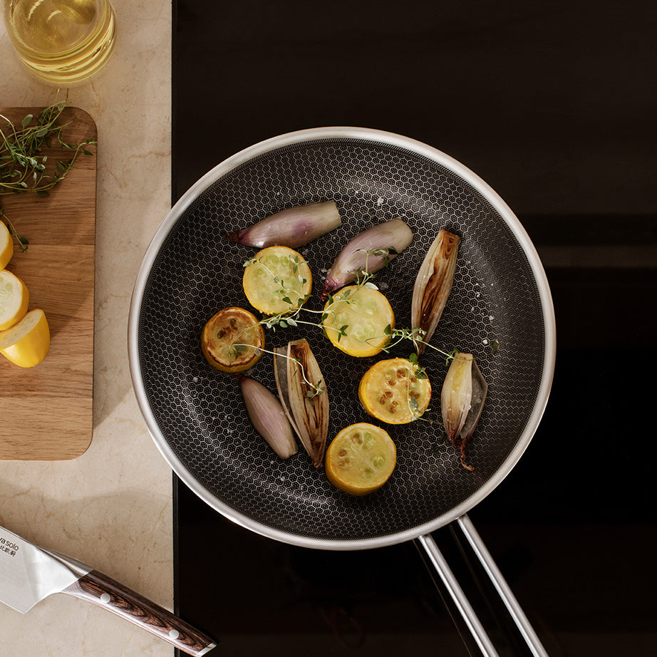With a durable ceramic and stainless steel design, Eva Solo's Multi Mosaic Pans are perfect for all of your cooking needs. The unique mosaic pattern and Slip-Let ceramic coating makes them resistant to metal utensils and allow for healthier cooking with less oil. With triple-layer technology that ensures even heat distribution and heat resistance up to 400°C, these pans are a must for any kitchen.