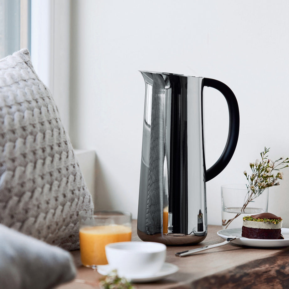 The functional, practical, and elegantly designed Nomu Thermo Insulated Jug from Alessi is perfect for the home or office. Nomu, meaning to drink in Japanese, is part of designer Naoto Fukasawa's collection of pieces designed for serving and drinking beverages. This sleek double-wall stainless steel vacuum jug keeps drinks hot or cold, and pressing down on the centre of the lid opens and closes it for pouring.