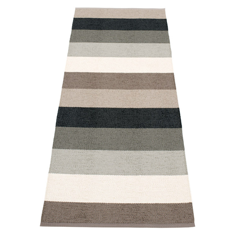 Designed and made in Sweden, Pappelina Rugs are beautiful and sturdy for indoor or outdoor use. The broad striped Molly Rug is made of certified phthalate free PVC ribbon, woven on traditional looms using wooden shuttles. The rug is machine washable and has reinforced and welded edges for added durability.