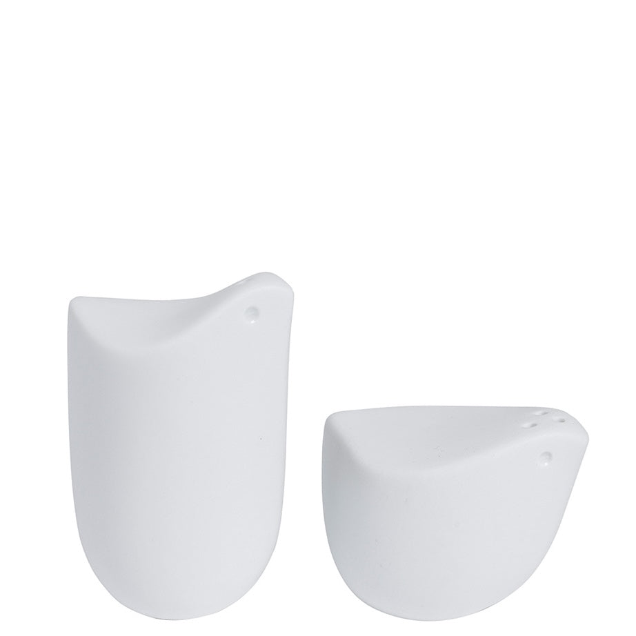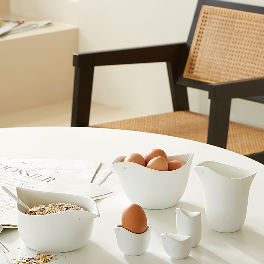 The pieces in Räder's Peep Serving Collection are characterized by a swooping, bird-like silhouette. The bright white porcelain pieces make a statement used separately or as a grouping at your table.