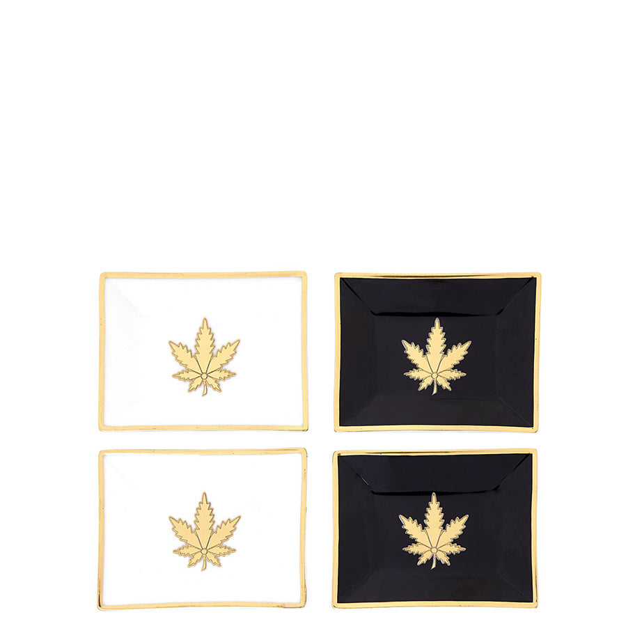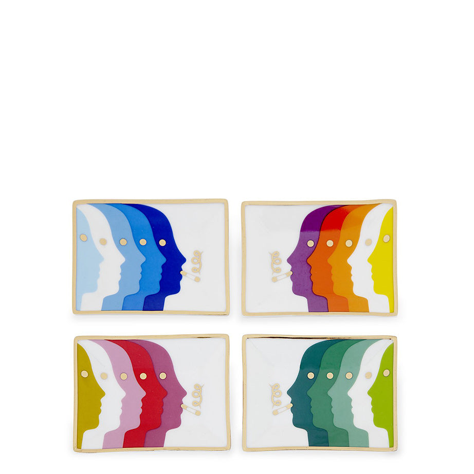 Add a touch of golden glam to your bedside, bathroom, or tabletop with Jonathan Adler's Petite Tray Sets. His signature saucy imagery is featured on each small porcelain tray. This set of four is packaged for giving.