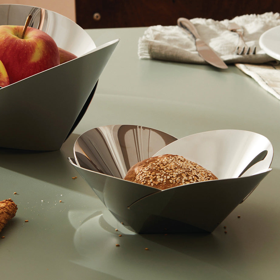 In addition to the Resonance Bowls and Harmonic Basket, Abi Alice collaborated with Alessi for the Pianissimo Basket. Her interest in geometry and mathematics is evident in the design of this piece. In the conception of this bowl original drawings were transformed into three-dimensional objects by cutting, bending, and curving steel sheets. A gleaming object in 18/10 stainless steel, the Pianissimo Bowl is a quietly sophisticated serving piece.