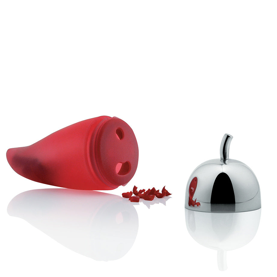 Designer Jim Hannon-Tan created the spicy little Piccantino for Alessi. This delightful chili scruncher in the shape of a hot red chili pepper has a silicone body and 18/10 polished stainless steel cap. Scrunch, shake, savour, and spice it up with Piccantino!