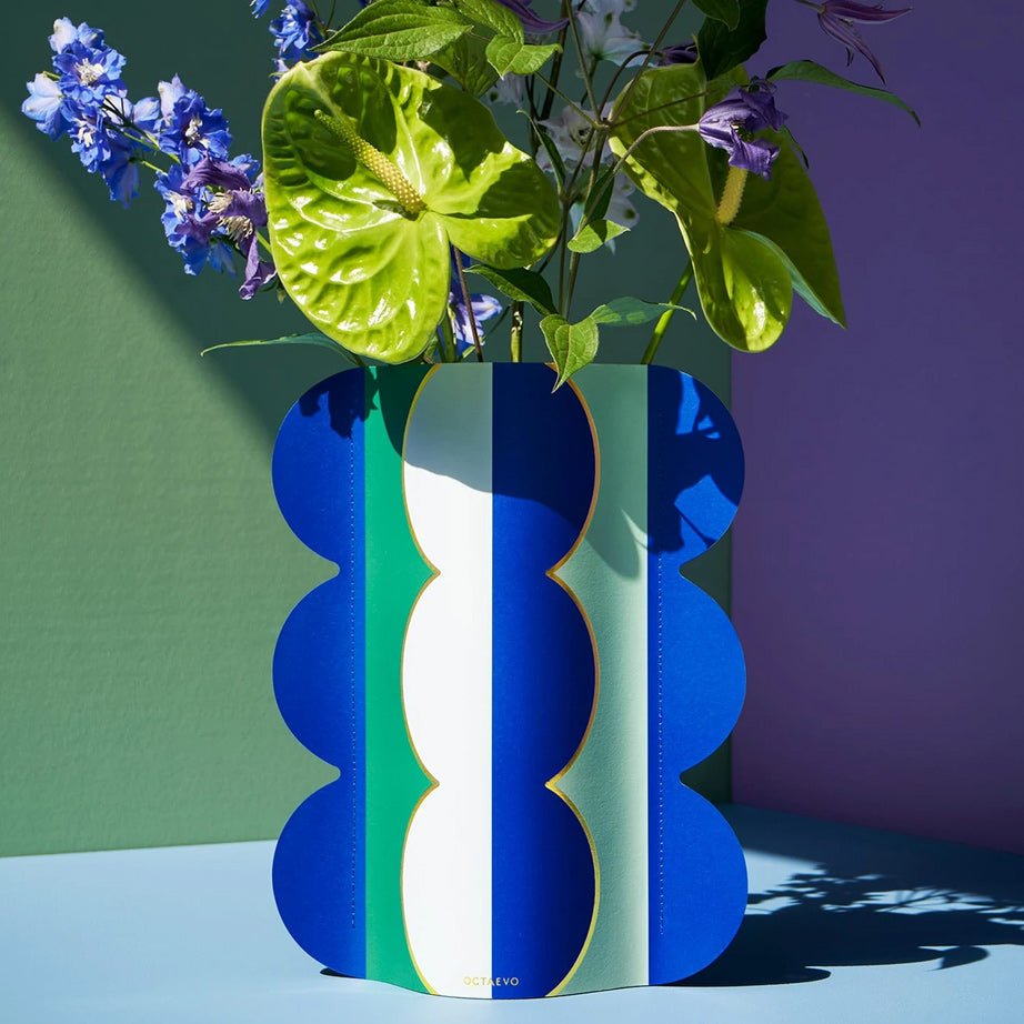 The Riviera Wave Paper Vase from Octaevo was inspired by designs from the 60s and the colours of the Mediterranean. Gently open the edges and place a glass, ceramic, or plastic container inside. Made of water resistant paper, filled with fresh blooms it makes a design statement.
