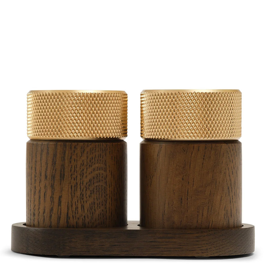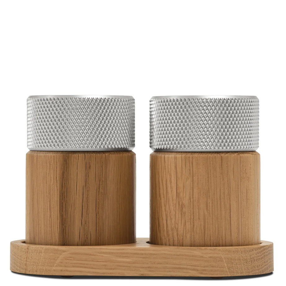 The Sina Salt & Pepper Set has a refied look and exceptional functionality. Designed by C.F. Møller Architects for Gejst, the mills feature a balance of a natural and industrial aesthetic with a cylindrical solid wood base and turned metal top. The CrushGrind® ceramic mechanism in each mill ensures precise grinding from fine to coarse. Presented on a sleek tray that keeps your table tidy, Sina enhances any dining experience.