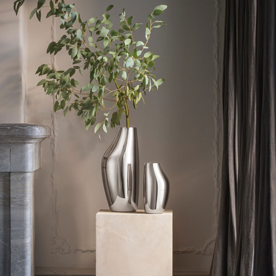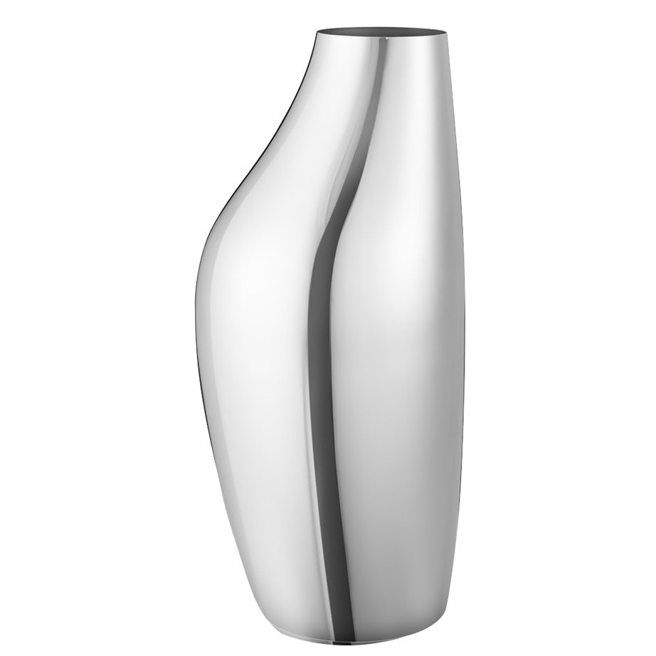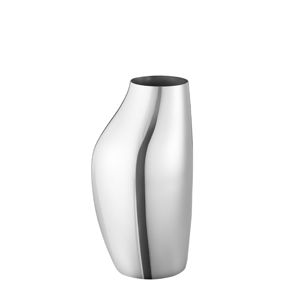 Aurelien Barbry designed these striking vases as part of his Sky Collection for Georg Jensen. The asymmetrical shape and organic curves are rendered in gleaming mirror polished stainless steel.
