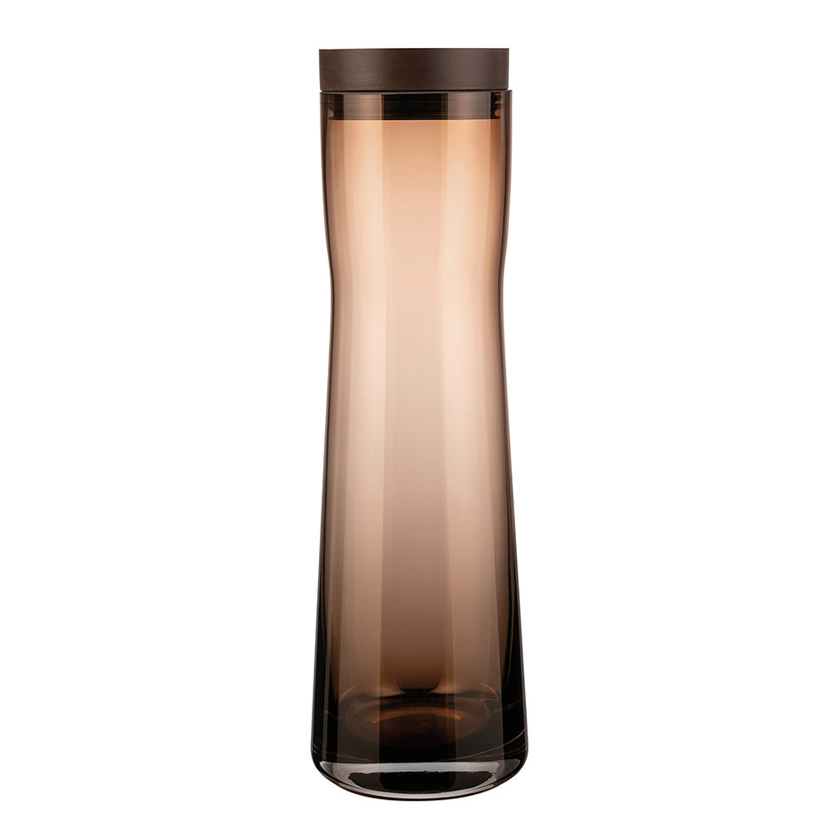 Smokey or coffee-coloured glass makes the Splash Water Carafe a sophisticated vessel for serving water. The curvy silhouette of the heat resistant glass carafe is topped by a silicone and stainless lid. Add ice, fruit, or herbs to your water – the lid will retain them inside the carafe as you pour.