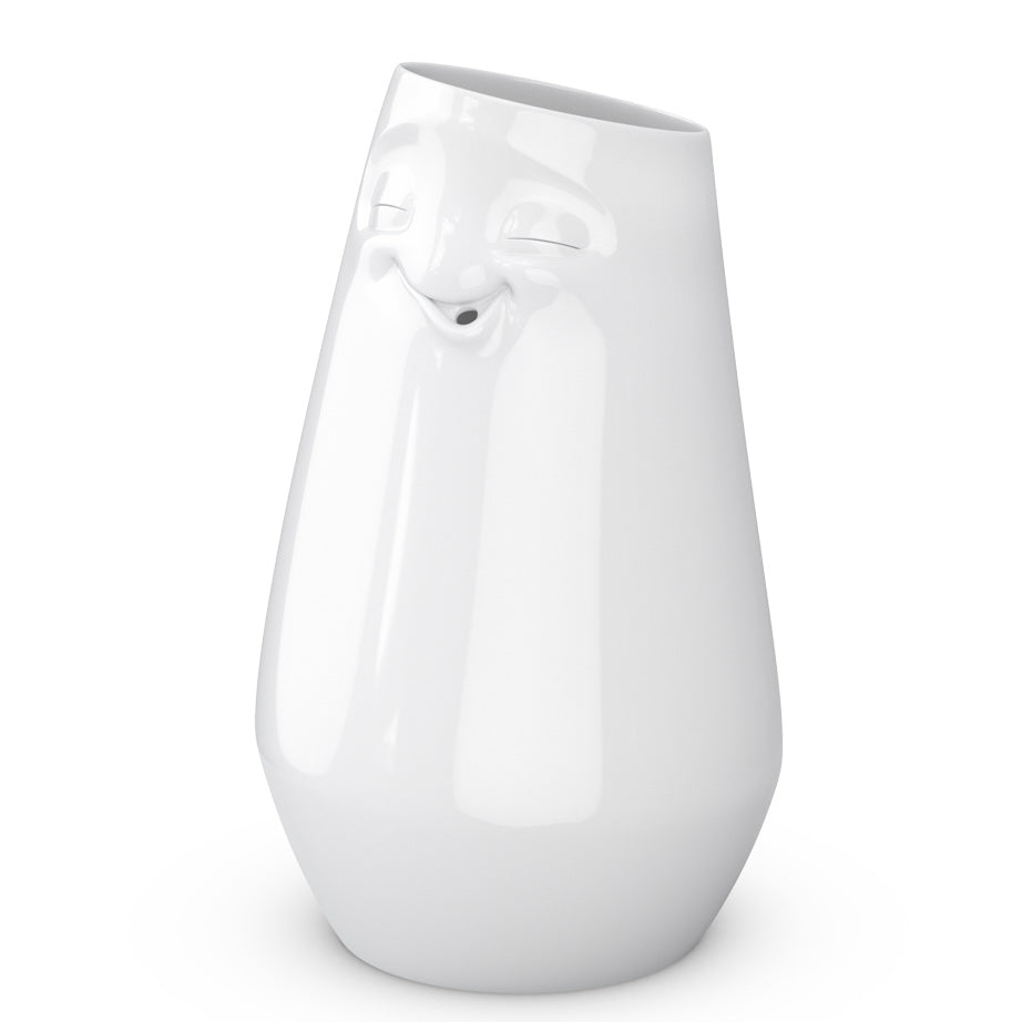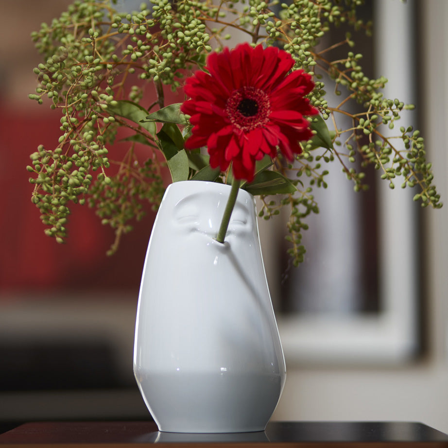 Every bouquet becomes a work of art in the Tassen Laid Back Vase. Crafted in white porcelain, a signature charming Tassen face enlivens the vase. Inside the smiling mouth a single bloom fits snuggly.