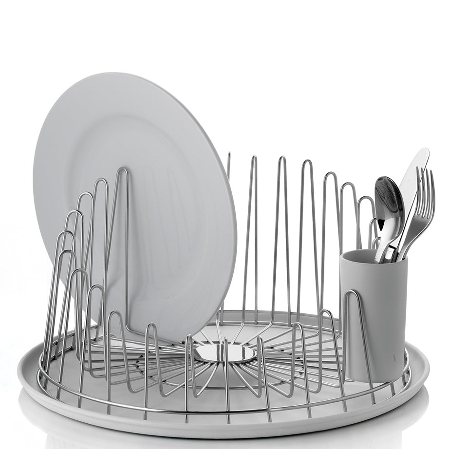 Designer Pauline Deltour created the functional and stylish A Tempo Dish Rack for Alessi. The round polished stainless steel rack holds plates and glassware of various sizes. A white thermoplastic resin cutlery holder is included. The rack fits on a thermoplastic resin tray to keep your counter neat.