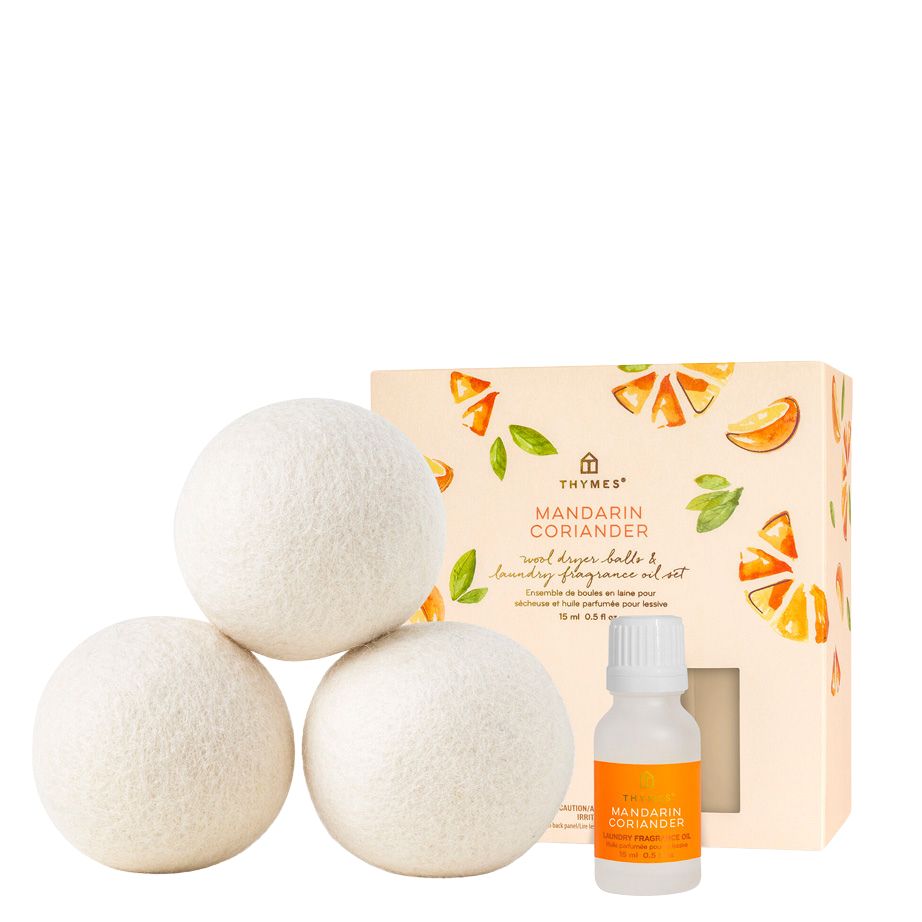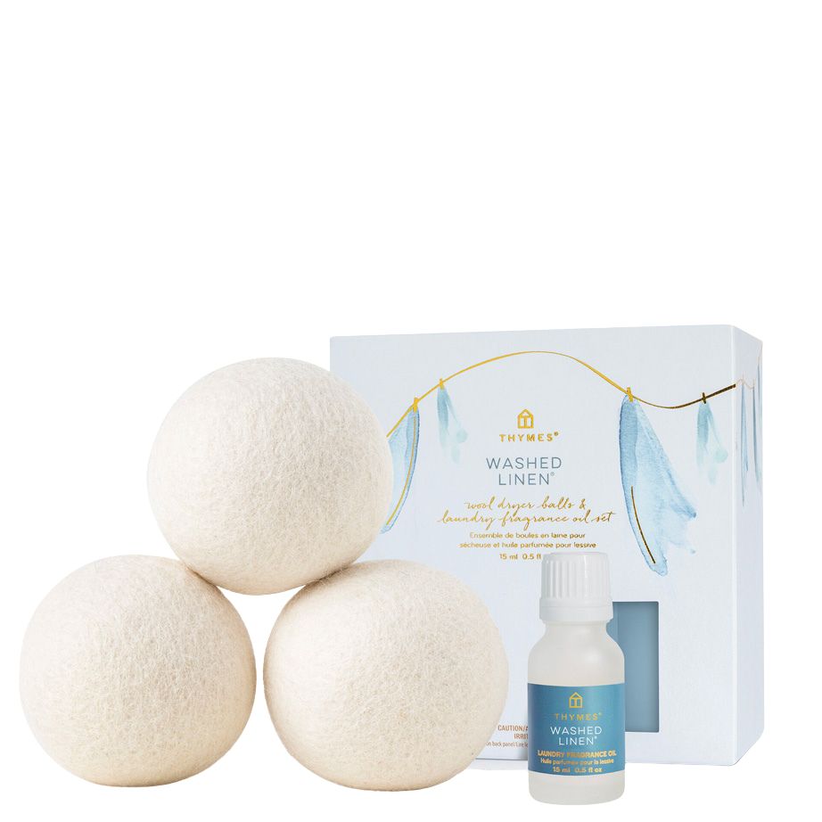 Efficiently soften and freshen your laundry with Thymes Laundry Sets. The eco-friendly Wool Dryer Balls reduce wrinkles and drying time. Add a few drops of the laundry-safe essential oils to the drying balls to leave a soft aromatic touch on fabrics.