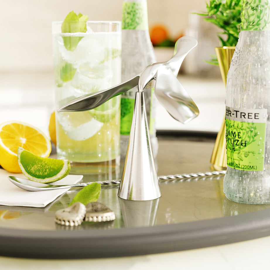 Umbra's Tipsy Bottle Opener combines functionality with refined design. This unique bar tool is crafted from durable cast metal with a polished chrome finish. Its distinctive balancing stand allows it to stand upright on any surface, making it both a practical tool and a striking decorative piece.
