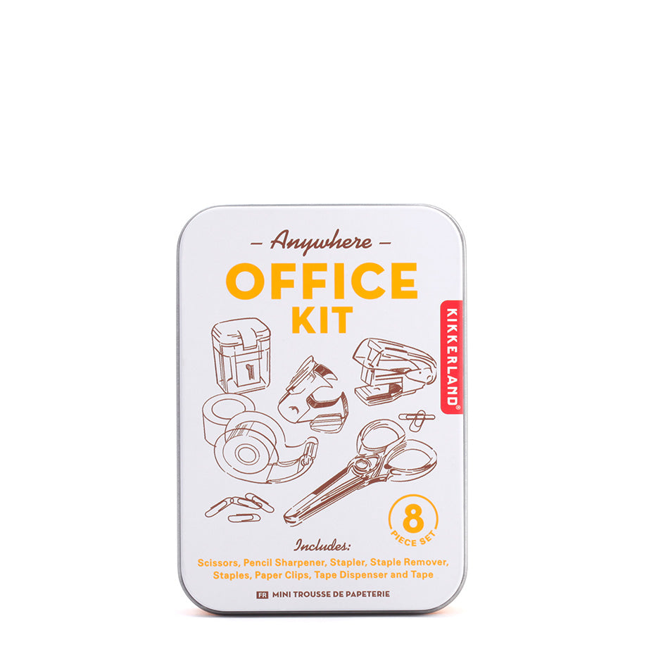 - Anywhere Office: Includes mini scissors, pencil sharpener, stapler, staple remover, paper clips, tape dispenser, and tape